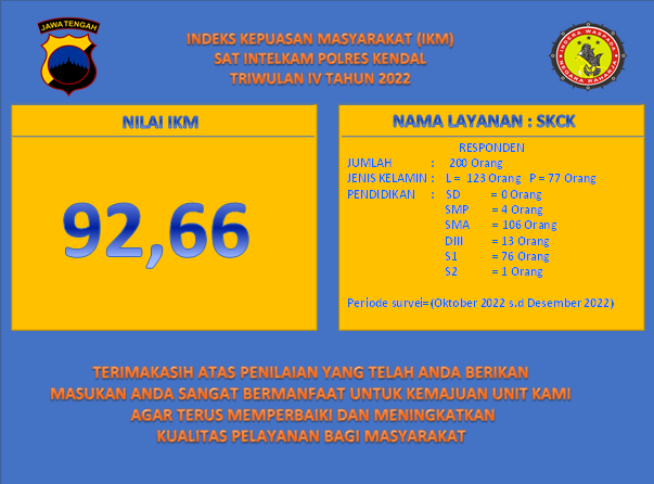 Dokumen Fasilitas SURVEY KEPUASAN MASYARAKAT (SKM) PELAYANAN SKCK TW IV 2022 15 Juni 2023 Polres Kendal 0 Komentar polres kendal, sat intelkam, SKCK