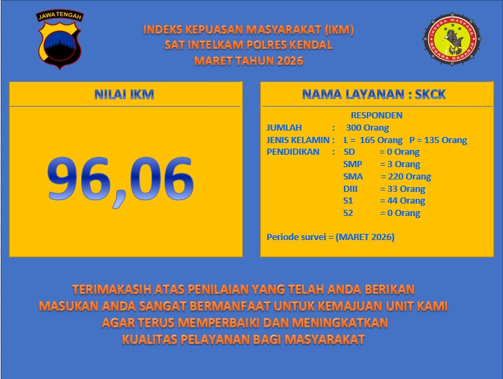 Dokumen Download Informasi Berkala Fasilitas New Post SURVEY KEPUASAN MASYARAKAT (SKM) SKCK POLRES KENDAL BULAN MARET 2026 20 April 2026 Polres Kendal 0 Komentar #POLRESKENDAL, sat intelkam, SKCK